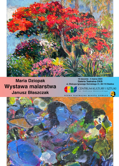 Czteromiesięczna podróż na hiszpańską wyspę Teneryfę zaowocowała pracami, które będą prezentowane na wystawie malarstwa Marii Dziopak i Janusza Błaszczaka w Galerii Teatralnej CKiS. Ich prace obejmują również motywy z polskich plenerów, począwszy od brzegu morza po Reymontówkę w Chlewiskach, która stała się dla nich nostalgiczną tęsknotą za corocznym jesiennym powrotem. Janusz Błaszczak, oczarowany pięknem i różnorodnością Teneryfy, słońcem i klimatem wyspy, przepełniony pozytywną energią, z radością oddawał się twórczemu szaleństwu. Podobnie, Maria Dziopak, wyznaje miłość do natury, wiatru, deszczu, chmur i promieni słonecznych przebijających się przez niebo. Kocha morze i jego spienione fale, czyste powietrze gór, zapach siana, kwiatów i ziół. Jej twórczość odbija miłość do zmieniających się odcieni tych wszystkich zjawisk. Barwny karnawał w Santa Cruz de Tenerife oraz swoboda relaksu na piaszczystych plażach Los Cristianos miały duży wpływ na powstanie prezentowanych dzieł.