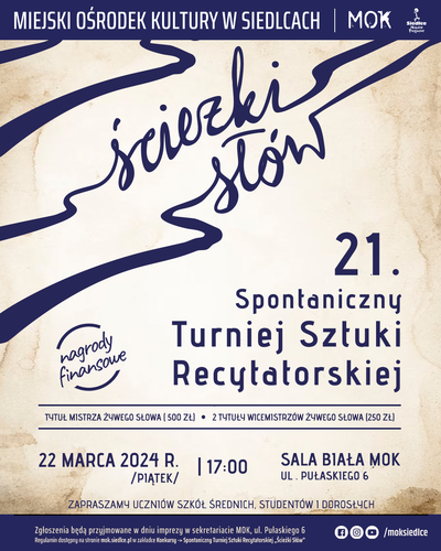 Zapraszamydo udziału w 21. Spontanicznym Turnieju Sztuki Recytatorskiej „Ścieżki Słów” wszystkich uczniów szkół średnich, studentów i dorosłych, którzy chcą mieć swój wkład w walkę o piękno naszej polskiej mowy i mają odwagę stanąć w szranki z ludźmi o podobnych zainteresowaniach i talentach, aby powalczyć o tytuł Mistrza Żywego Słowa.