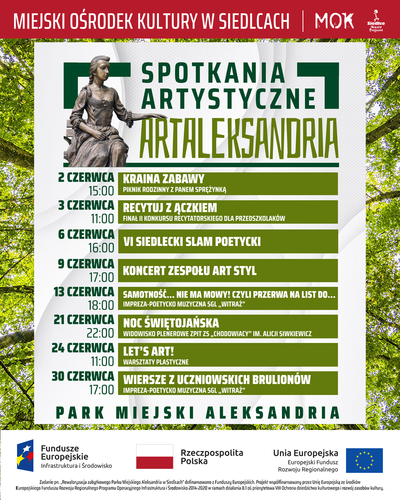Zadanie pn. "Rewaloryzacja zabytkowego Parku Miejskiego Aleksandria w Siedlcach". Projekt współfinansowany przez Unię Europejską ze środków Europejskiego Funduszu Rozwoju Regionalnego Programu Operacyjnego Infrastruktura i Środowisko 2014-2020 w ramach działania 8.1 oś priorytetowa VIII Ochrona dziedzictwa kulturowego i rozwój zasobów kultury.