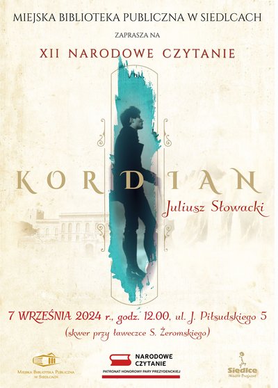 Miejska Biblioteka Publiczna w Siedlcach już po raz trzynasty aktywnie włącza się w organizowanie Narodowego Czytania. Czytają z nami przedstawiciele społeczności naszego miasta. Wydarzenie jest prawdziwym świętem słowa pisanego, które na stałe wpisało się w kalendarz kulturalny Siedlec. W tym roku czytamy „Kordiana” Juliusza Słowackiego, dramat romantyczny napisany w 1833 roku.