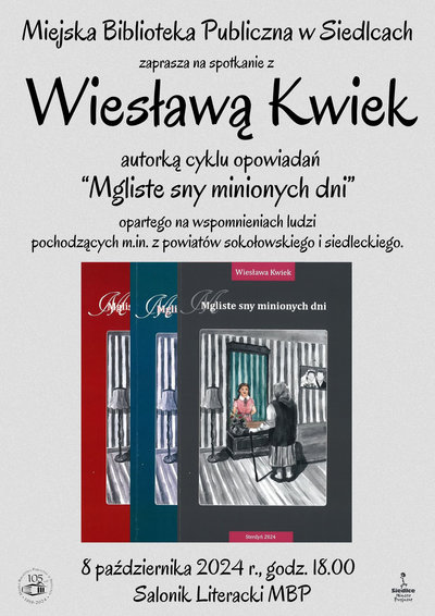 Miejska Biblioteka Publiczna w Siedlcach zaprasza na spotkanie z Wiesławą Kwiek, podczas którego odbędzie się promocja trzeciego tomu opowiadań pt. „Mgliste sny minionych dni”. To kontynuacja dwóch poprzednich części, które okazały się jesienią 2019 roku, jednocześnie dopełnienie i zamknięcie cyklu.