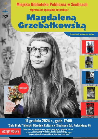 Miejska Biblioteka Publiczna w Siedlcach zaprasza na spotkanie autorskie z Magdaleną Grzebałkowską - autorką bestsellerowych biografii ks. Jana Twardowskiego, Krzysztofa Komedy oraz Tomasza i Zdzisława Beksińskich. Laureatką Nagrody Grand Press oraz Śląskiego Wawrzynu Literackiego. W 2016 roku nominowaną do Nagrody Literackiej Nike za książkę „1945. Wojna i pokój”. Współautorką wraz z Ewą Winnickądwóch książek „Jak się starzeć bez godności” i„Na bogato. Jak się starzeć bez godności 2”.