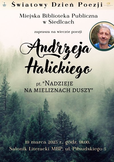 Miejska Biblioteka Publiczna w Siedlcach zaprasza na wieczór poezji Andrzeja Halickiego zorganizowany z okazji Światowego Dnia Poezji. Andrzej Halicki jest doktorem nauk prawnych, autorem książek naukowych z zakresu prawa i samorządu oraz książek poetyckich: „Miłość i inne przypadki”, „Westchnienie”, „Ludzie bezcelowi”, „Między ciszą a milczeniem” w tym najnowszej „Nadzieje na mieliznach duszy”. Mieszka w Białej Podlaskiej. Ceni sobie pracę społeczną, naturę i zwierzęta. 19 marca 2025., godz. 18.00, Salonik Literacki MBP, ul. J. Piłsudskiego 5