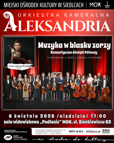 Zapraszamy na magiczny wieczór z Orkiestrą Kameralną Aleksandria! Wyruszymy w podróż do romantycznego świata pełnego emocji, pasji i pięknych melodii. Gościem specjalnym będzie skrzypek Karol Lipiński-Brańka. W programie znajdą się utwory Edvarda Griega, Jeana Sibeliusa i Johana Svendsena.