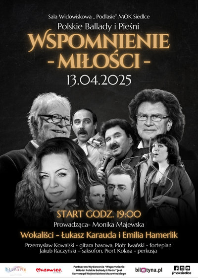 Koncert „Wspomnienie Miłości” to piękna podróż w czasie, podczas której cofniemy się do XVIII wieku i usłyszymy pieśni wspaniałego kompozytora i dyrygenta Mieczysława Karłowicza „Pamiętam ciche jasne złote dnie” oraz Stanisława Moniuszko „Znasz-li ten kraj” i „Prząśniczka”. Przenosząc nas do XIX wieku koncert uświetnią znane pieśni polskiego artysty Mieczysława Fogga m.in. „Ta ostatnia niedziela”.