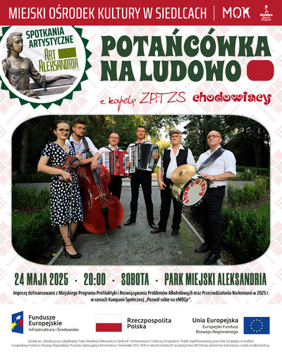 Po raz kolejny Park Aleksandria rozbrzmi dźwiękami muzyki ludowej, a alejki wypełnią się tańcem i radością! Zapraszamy serdecznie na „Potańcówkę na ludowo” z kapelą Zespołu Pieśni i Tańca Ziemi Siedleckiej „Chodowiacy” im. Alicji Siwkiewicz. To doskonała okazja, by oderwać się od codziennego zgiełku i poczuć klimat dawnych zabaw. Kapela zespołu „Chodowiacy” porwie uczestników do tańca przy dźwiękach muzyki ludowej i biesiadnej.Zadanie pn. „Rewaloryzacja zabytkowego Parku Miejskiego Aleksandria w Siedlcach". Projekt współfinansowany przez Unię Europejską ze środków Europejskiego Funduszu Rozwoju Regionalnego Programu Operacyjnego Infrastruktura i Środowisko 2014-2020 w ramach działania 8.1 oś priorytetowa VIII Ochrona dziedzictwa kulturowego i rozwój zasobów kultury.