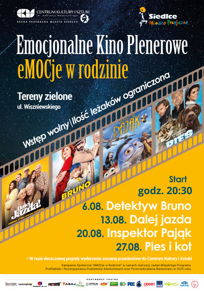Zapraszamy na wyjątkowe, letnie wieczory z filmem pod gołym niebem! W każdą środę sierpnia o godz. 20:30 na terenach zielonych przy ul. Wiszniewskiego kontynuujemy cykl seansów pod wspólnym hasłem „eMOCje w Rodzinie – Emocjonalne Kino Plenerowe”.