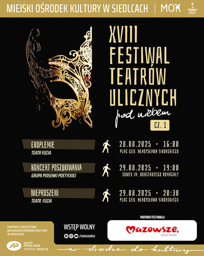 Miejski Ośrodek Kultury w Siedlcach zaprasza na wyjątkowe spotkanie ze sztuką w przestrzeni miejskiej! Festiwal Teatrów Ulicznych „pod Niebem” to wydarzenie, które od lat przyciąga mieszkańców Siedlec i całego regionu, oferując niecodzienne widowiska pełne emocji, humoru, zaskoczeń i teatralnej magii – wszystko to na świeżym powietrzu, bez kurtyny i granic.