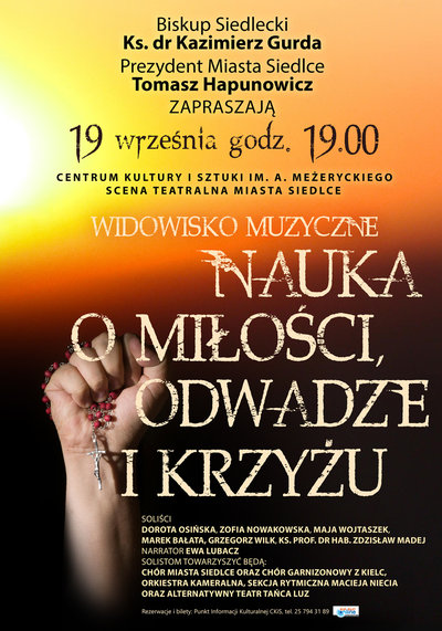 Widowisko ,,Nauka o miłości, odwadze i Krzyżu” nawiązuje do wydarzeń z 7 marca 1984 r. Wtedy czterystu uczniów Zespołu Szkół Rolniczych w Miętnem ogłosiło strajk okupacyjny w obronie obecności krzyży w ich szkole. Kiedy wieczorem w placówce pojawił się prokurator i zagroził pacyfikacją, młodzi ludzie zdecydowali się na opuszczenie budynku. Decyzją dyrekcji szkoły zajęcia zostały zawieszone do odwołania. Treści, emocje i uczucia towarzyszące walecznej młodzieży z tamtych czasów zostały zilustrowane mocą słowa, ruchu i dźwięku. Scenariusz całego wydarzenia opracowała nauczycielka j. polskiego Bogusława Gora z ówczesnego ZSR w Miętnem, która po poparciu strajkującej młodzieży straciła pracę w szkole. Widowisko oparte jest na 16 utworach muzycznych o różnorodnej stylistyce i gatunku, dobranych do szerokiego grona odbiorców. Teksty napisał Lech Makowiecki, zaś muzykę skomponował Maciej Nieć.