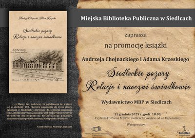 Miejska Biblioteka Publiczna w Siedlcach ma zaszczyt poinformować, że jest wydawcą książki autorstwa Andrzeja Chojnackiego i Adama Krzeskiego pt. „Siedleckie pożary. Relacje i naoczni świadkowie”.
