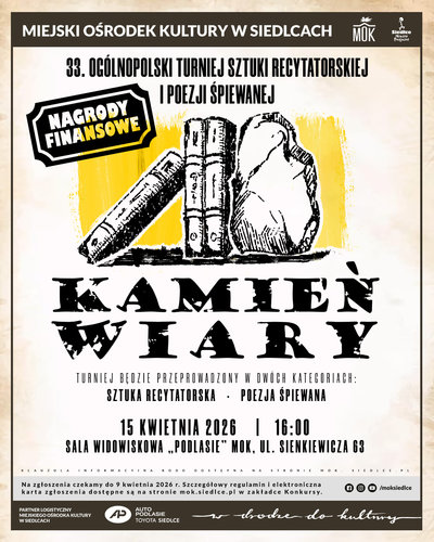 Na zgłoszenia czekamy do 9 kwietnia 2026 r. Szczegółowy regulamin i elektroniczna karta zgłoszenia dostępne są na stronie mok.siedlce.pl w zakładce Konkursy → Ogólnopolski Turniej Sztuki Recytatorskiej i Poezji Śpiewanej „Kamień Wiary”.