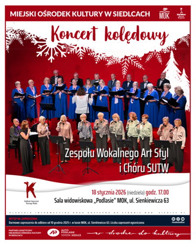 Koncert kolędowy Chóru Siedleckiego Uniwersytetu Trzeciego Wieku oraz Zespołu Wokalnego Art Styl będzie pięknym, zimowym spotkaniem muzycznym i okazją, by ponownie zanurzyć się w świąteczny klimat. Usłyszymy i wspólnie zaśpiewamy najpiękniejsze polskie kolędy oraz pastorałki w autorskich aranżacjach.