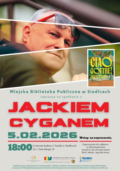 Miejska Biblioteka Publiczna w Siedlcach zaprasza na wyjątkowe spotkanie z Jackiem Cyganem – wybitnym autorem tekstów piosenek, poetą, prozaikiem i osobowością telewizyjną. Jest on twórcą słów do setek kultowych utworów, które na stałe wpisały się w historię polskiej kultury popularnej i literatury. Jego wrażliwość, lekkość języka oraz umiejętność opowiadania o sprawach ważnych w prosty, a zarazem poruszający sposób sprawiają, że od lat cieszy się ogromnym uznaniem czytelników i słuchaczy.